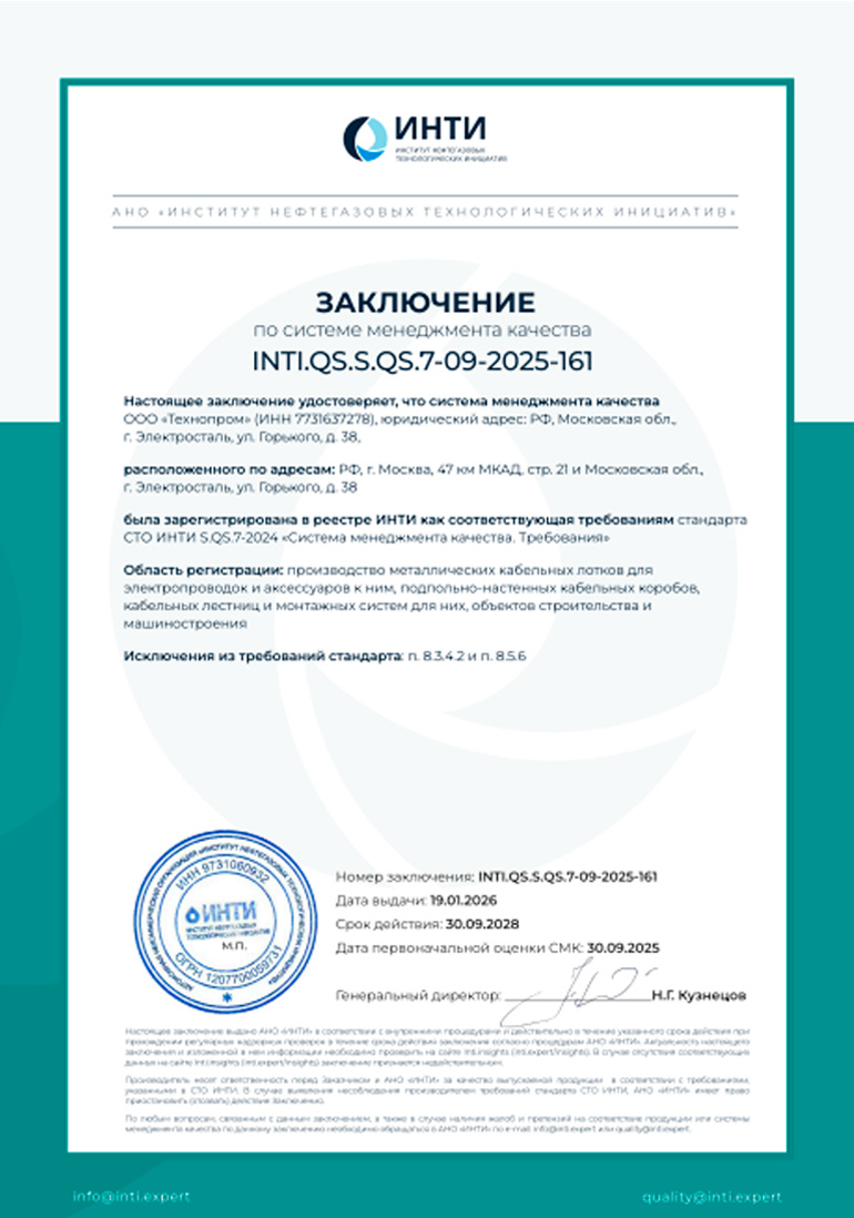 Компания ООО «Технопром» зарегистрирована в реестре ИНТИ как соответствующая требованиям стандарта СТО ИНТИ S.QS.7-2024 «Система менеджмента качества. Требования». Номер заключения по системе мендежмента качества INTI.QS.S.QS.7-09-2025-161